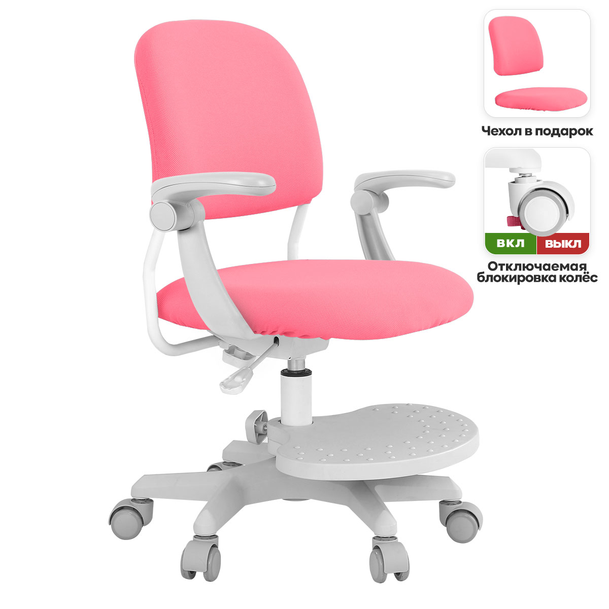 - Подлокотники можно опустить или поднять. Ребёнок легко может задвинуть их, чтобы подвинуться к столу или встать из-за кресла.